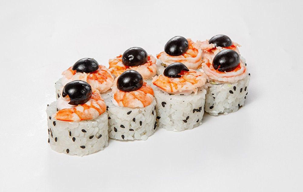 Рис, нори, креветка тигровая, сыр творожный, огурец, помидор, сливочный соус с креветкой, кунжут, оливки