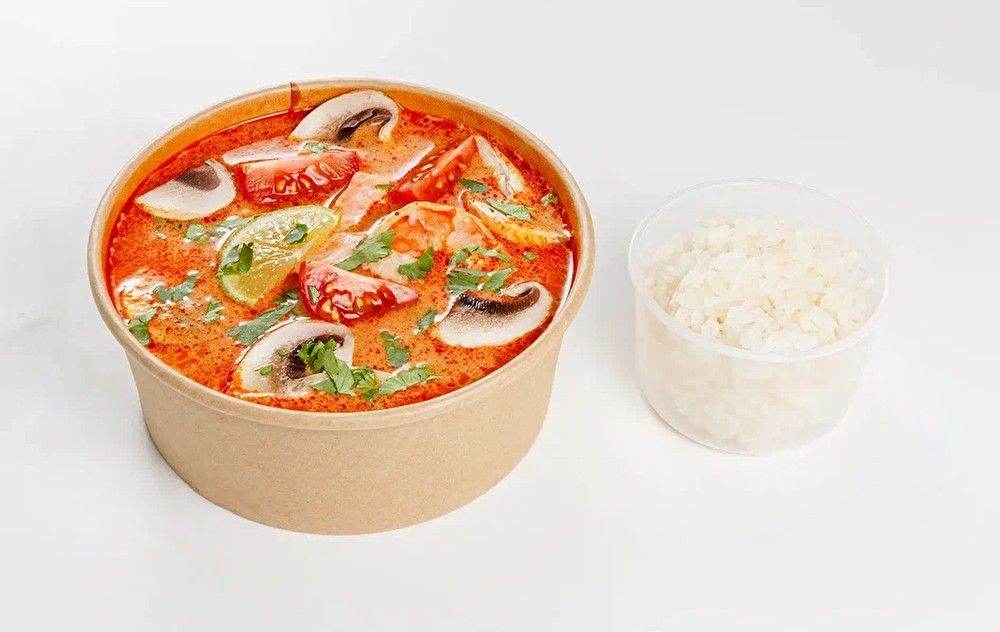 Паста Том ям, кокосовым молоко, креветки тигровые, помидоры черри, шампиньоны, лайм, кинза, рис.