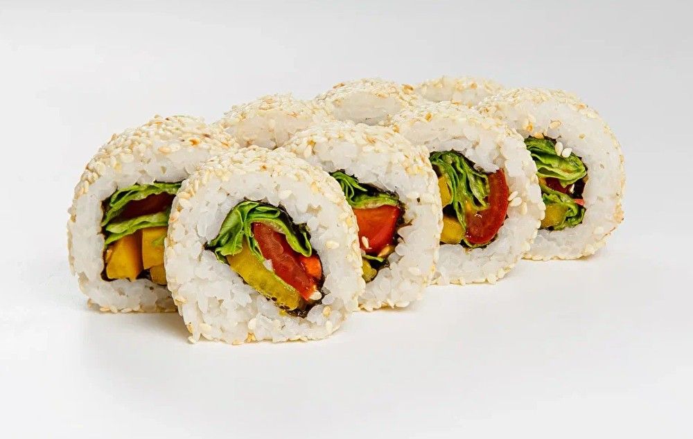 Рис, нори, семена кунжута, салат айсберг, болгарский перец, помидор.