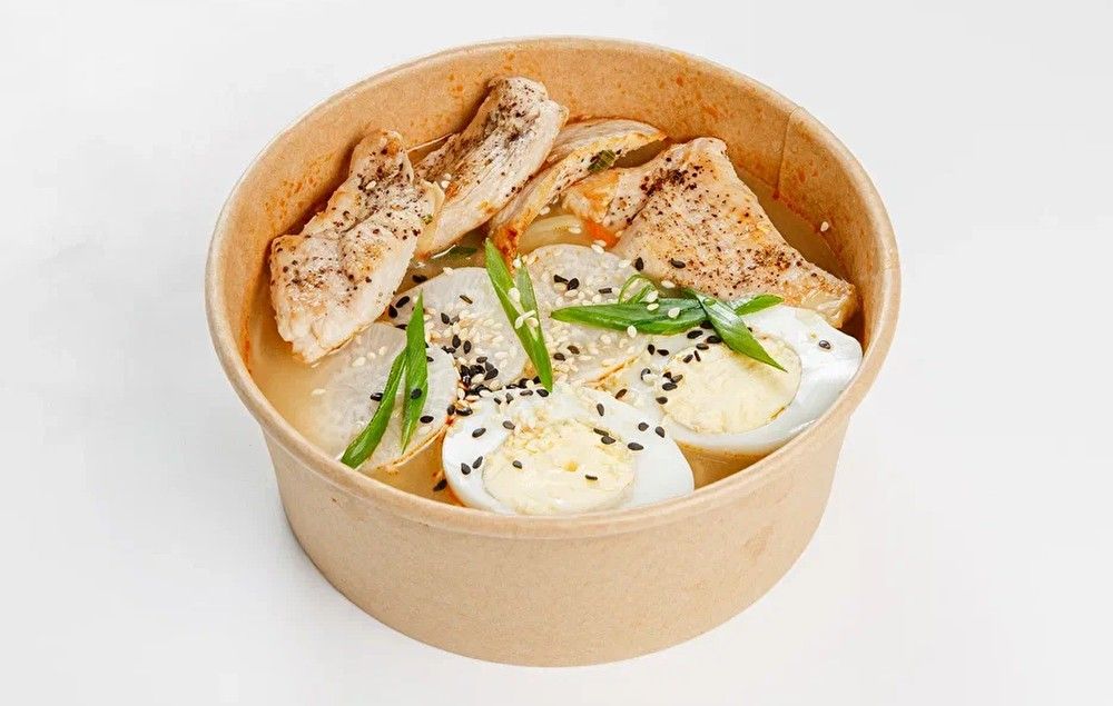 Бульон на выбор сырный/классической куриное филе, лапша, яйцо куриное, дайкон, лук зеленый, семена кунжута.