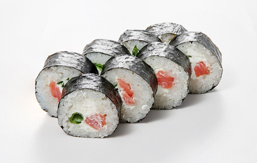 Рис, нори, лосось копченый, сыр творожный, лук зеленый