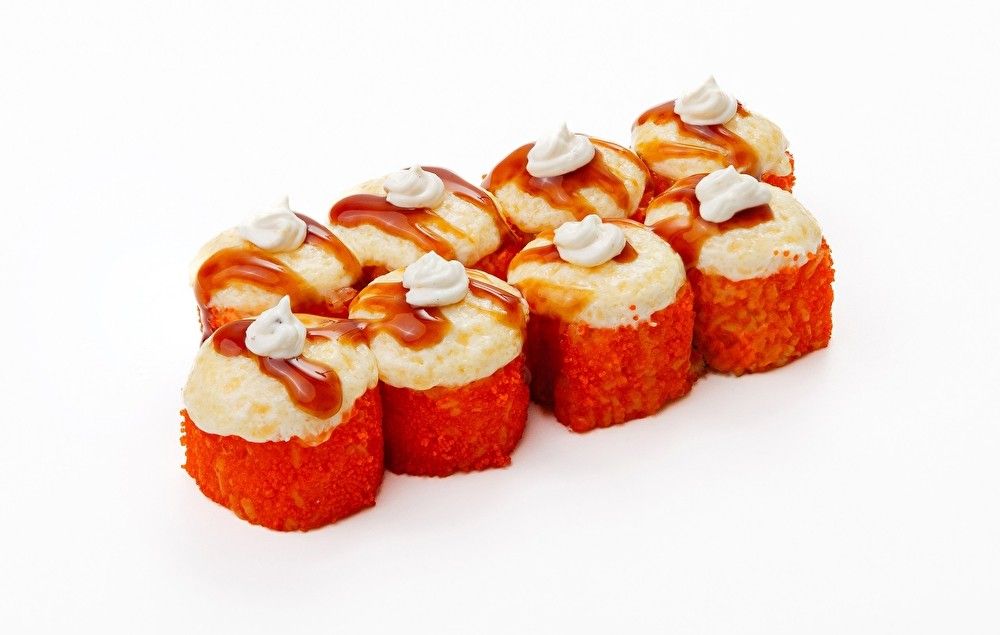 Рис, нори, снежный краб, огурец, креветка, сырная шапка, тобика, унаги соус, кисло сладкий соус