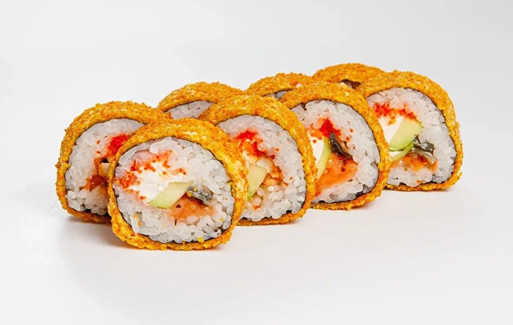 Рис, нори, твороженный сыр, тобика, панировочные сухари, кляр, авокадо, жаренный угорь, лосось.