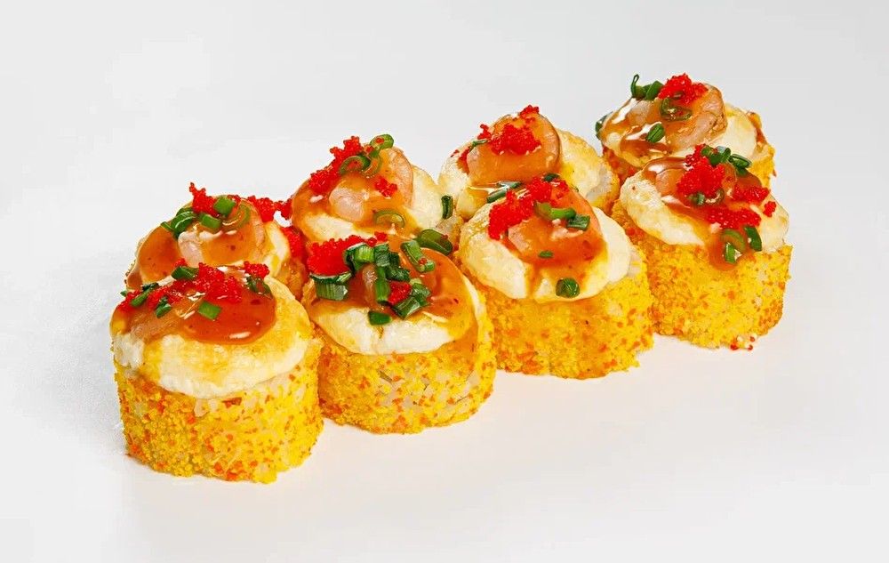 Рис, нори, сыр твороженный, креветки, огурец, сырная шапка, икра тобико, соус манго чилли, лук зеленый, панировочные сухари.