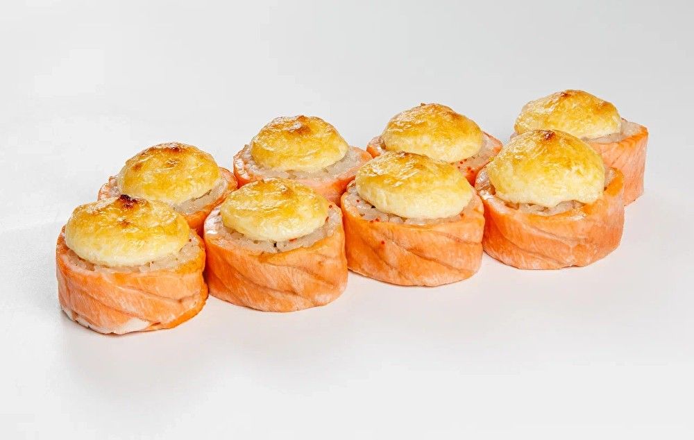 Рис, нори, филе лосося, сыр творожный, огурец, сырная шапка