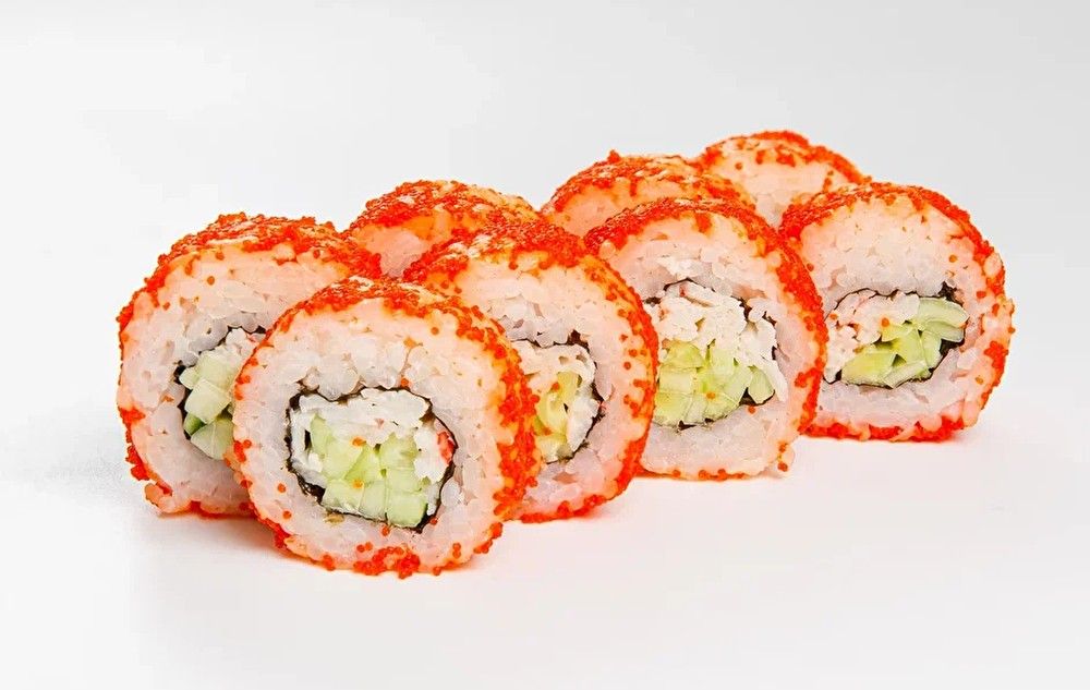 Рис, нори, твороженный сыр, снежный краб, огурец, икра тобико.