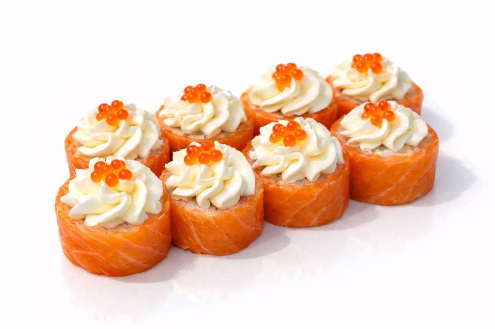 Рис, нори, сыр творожный, снежный краб, авокадо, лосось, икра красная