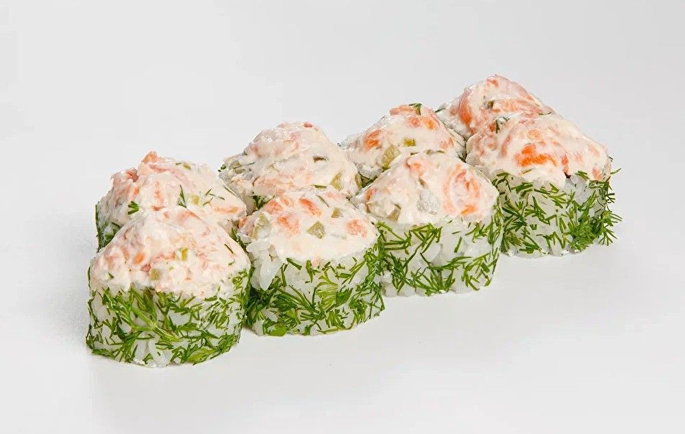 Рис, нори, твороженный сыр, укроп, тартар из лосося.