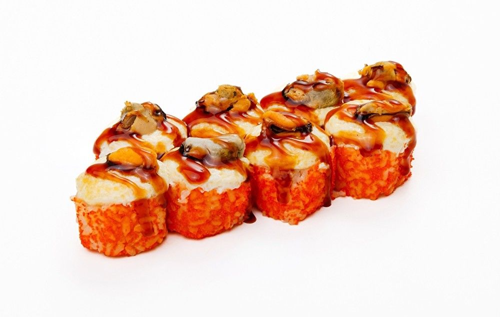 Рис, нори. сыр творожный, огурец, мидии, сырная шапка, тобика, унаги соус