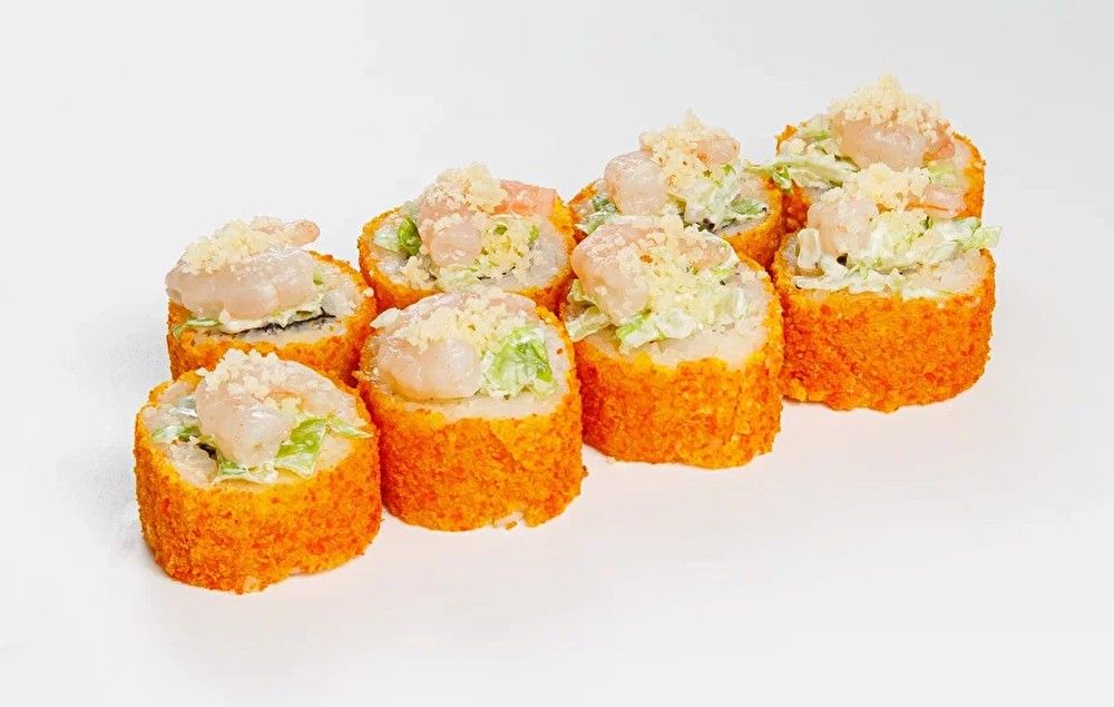 Рис, нори, твороженный сыр, омлет тамаго, салат айсберг, соус цезарь, креветки, пармезан, панировочные сухари.