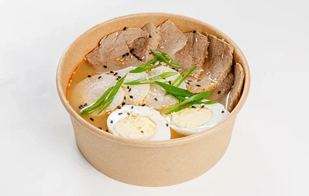 Бульон на выбор сырный/классической Говядина, лапша, яйцо куриное, дайкон, лук зеленый, семена кунжута.