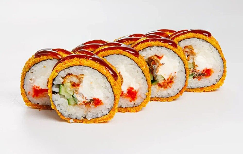 Рис, нори, твороженный сыр, тобика, панировочные сухари, кляр, жаренный угорь, соус унаги, огурец.