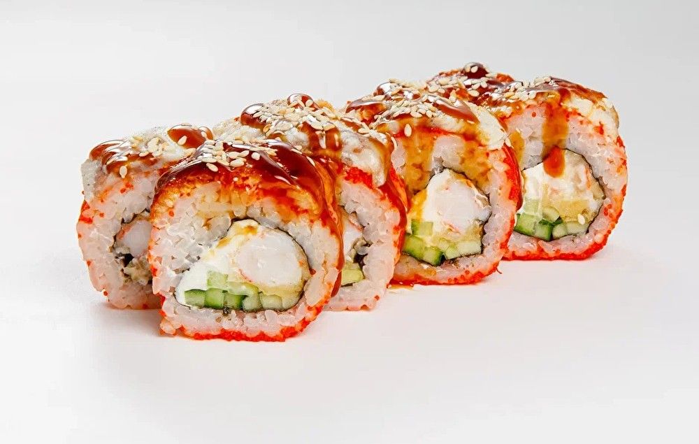 Рис, нори, тигровая креветка жаренная в кляре, твороженный сыр, огурцы, жаренный угорь, соус унаги, семена кунжута.