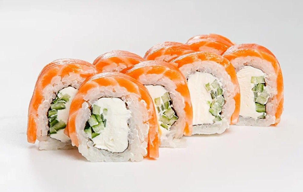 Рис, нори, твороженный сыр, слабосоленый лосось, огурец.