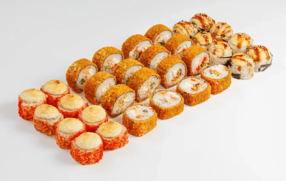 Запеченный с крабом Запеченный с угрём Темпура с креветкой Темпура с лососем 32 шт.