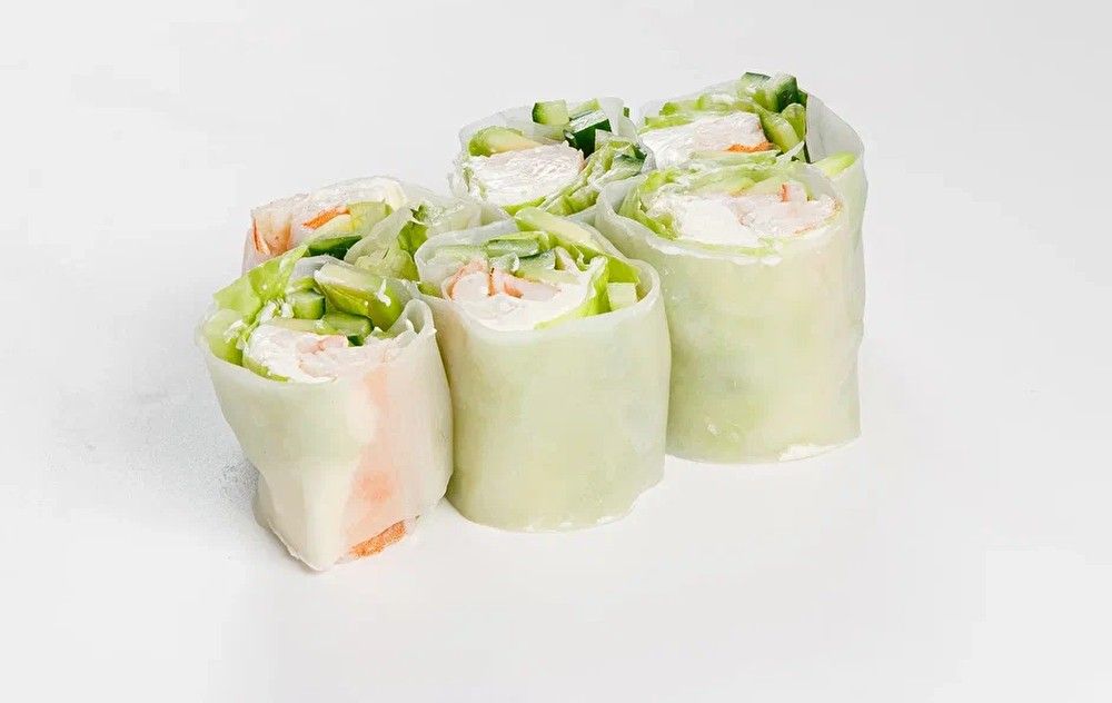 Рисовая бумага, твороженный сыр, огурец, салат айсберг, тигровые креветки.