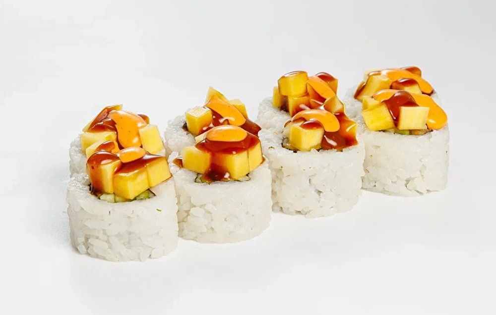 Рис, нори, тигровая креветка жаренная в кляре, огурец, манго, соус спайси, соус унаги.