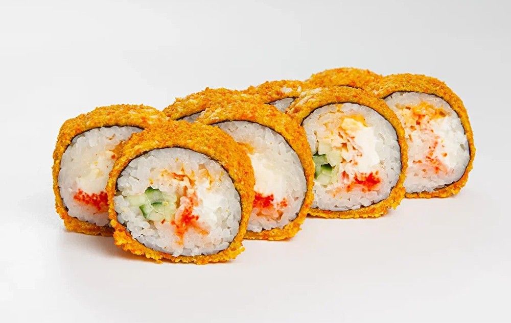 Рис, нори, твороженный сыр, тобика, панировочные сухари, кляр, лосось, огурец.