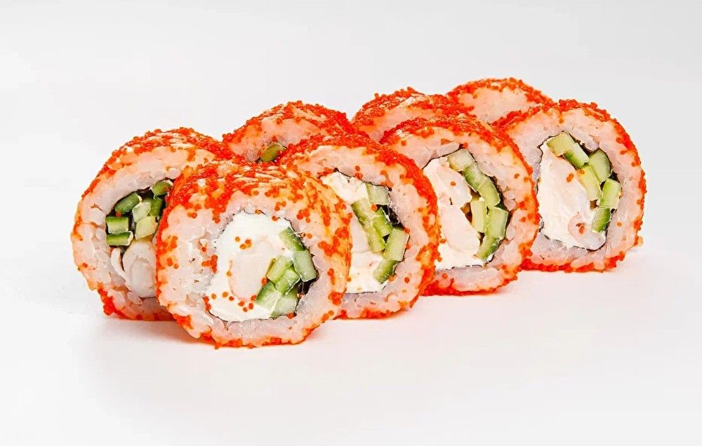 Рис, нори, твороженный сыр, тигровая креветка, огурец, икра тобико.